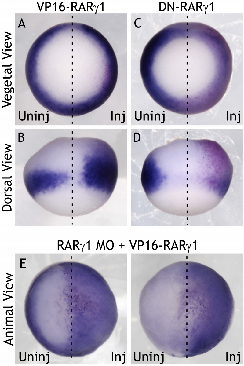 RARγ1 is required for the expression of mesoderm markers. (A-D) Embryos were microinjected unilaterally at the 2-cell or 4-cell stage with 3.3â