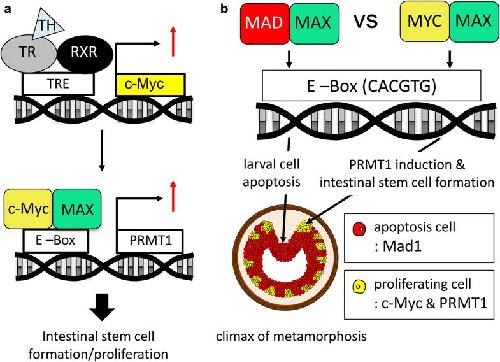 A balance of Mad and Myc controls cell fate determination during intestinal remodeling. a For T3-induced genes, TR normally functions as a heterodimer with RXR (9-cis retinoic acid receptor). During metamorphosis, T3 induces the expression of c-Myc directly at the transcription level through TR binding to the TRE in the c-Myc promoter. Then, c-Myc activates the expression of histone methyltransferase PRMT1 through binding to the intronic enhancer in the PRMT1 gene. PRMT1, in turn, participates in the intestinal stem cell formation/proliferation. b Both Mad1 and c-Myc can heterodimerize with Max. Thus, Mad1 competes against c-Myc to regulate target gene expression. When high levels of Mad1 are present in a cell, Mad1 causes mitotically active larval epithelial cells to exit the cell cycle to facilitate their degeneration through apoptosis. Whereas, high levels of c-Myc competes again Mad1 to activate PRMT1 expression. PRMT1, in turns, participates in the formation and/or proliferation adult intestinal stem cells. High levels of Mad1-expressing cells, undergoing apoptosis, are indicated by red dots. The c-Myc and PRMT1-expressing cells, which are proliferating adult stem cells, are indicated by yellow dots