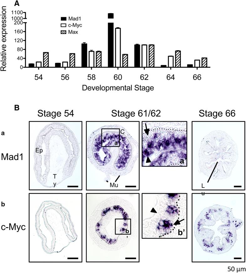 High levels of Mad1 mRNA are present in the degenerating larval epithelial cells facing the lumen while c-Myc is expressed in the proliferating adult cells at the climax of intestinal remodeling. A Both Mad1 and c-Myc, but not their dimerization partner Max, are upregulated, during intestinal remodeling. RT-PCR was performed using whole intestine to compare the expression profiles of Mad1, c-Myc, and Max during X. laevis intestinal metamorphosis. The mRNA level for Mad1, c-Myc and Max was normalized against that of EF1α RNA. The data are shown in arbitrary unit as the meanâ±âS.E. (nâ=â3). See [58] for more details. B Mad1 but not c-Myc is expressed in the larval cells undergoing apoptosis at the climax of intestinal remodeling. Cross-sections of X. laevis intestine at premetamorphic stage 54, metamorphic climax stages 61/62 and the end of metamorphosis (stage 66) were hybridized with Mad1 (a) and c-Myc (b) antisense probe. The boxed region in (a and b) at stage 61/62 were enlarged and shown in (aâ² and bâ²), respectively. Note that Mad1 expression was limited to dying larval epithelial cells facing the intestinal lumen at the climax of metamorphosis. The expression of c-Myc was also high at the climax of metamorphosis but was in the epithelial layer close to the connective tissue. Arrows point to clusters of cells or islets in the epithelium close to the connective interface and expressing c-Myc, whereas arrowheads point to the epithelial cells facing the lumen, expressing Mad1. The approximate epitheliumâmesenchyme boundary was drawn based on morphological differences between epithelial cells and mesenchyme cells in the photographs, under enhanced contrast and/or brightness by using Photoshop, if needed (dotted lines). Scale bar, 50 μm. CT connective tissue, Ep epithelium, Mu muscle, Lu lumen, Ty typhlosole. See [58] for more details