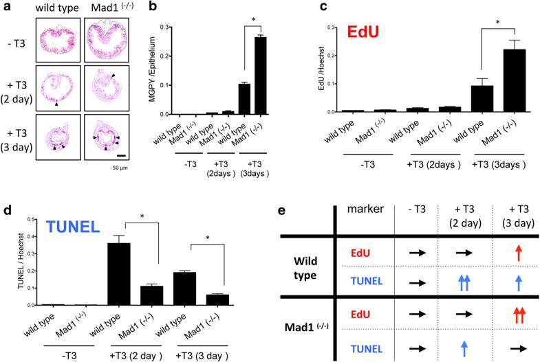 Mad1 regulates developmental cell death and Mad–Myc balance controls the expansion of adult intestinal epithelial cells. a Methyl green-pyronin Y (MGPY) staining, which stained the proliferating adult epithelial cells strongly (purple), reveals increased adult stem cell clusters in the knockout animals compared to those in the wild-type tadpoles after 3 days of T3 treatment. Premetamorphic stage 54 tadpoles were treated with 5 nM T3 for 0, 2 or 3 days and were killed 30 min after EdU injection. See [58] for more details. b Quantitative analysis of MGPY-positive areas in the epithelium and normalized by the total cellular area in epithelium. The statistical significance of the differences was determined by Student’s t test (*P < 0.05). Tadpoles of each genotype (n = 3–5) were used for counting MGPY-positive areas in the epithelium. See [58] for more details. c Cell proliferation is significantly increased in Mad1 (−/−) tadpoles treated with T3 for 3 day compared to that in the wild-type ones. Cross-sections of the intestine of the tadpoles above were stained for cell proliferation by EdU staining. EdU positive areas in epithelium of X. tropicalis intestine were measured and normalized against the total cellular area in epithelium determined by Hoechst staining. The statistical significance of the differences was determined by Student’s t-test (*P < 0.05). Tadpoles of each genotype (n = 3–5) were used for counting EdU-positive areas in the epithelium. See [58] for more details. d More intestinal epithelial cell death in T3-treated wild-type animals than that in Mad1 (−/−) tadpoles. Cross-sections of the intestine of the tadpoles above were stained for apoptosis by TUNEL. Quantitative analysis of apoptosis by counting TUNEL-positive areas in the epithelium and normalized by the total cellular area in epithelium determined by Hoechst staining. The statistical significance of the differences was determined by Student’s t-test (*P < 0.05). Tadpoles of each genotype (n = 3–5) were used for counting TUNEL-positive areas in the epithelium. See [58] for more details. e Summary of the changes in cell proliferation (EdU) and apoptosis (TUNEL) in the intestinal epithelium after 5 nM T3 treatment for 0, 2 or 3 days in wild type and Mad1-knockout animals. Note that Mad1 knockout not only enhances the cell proliferation but also reduces cell death in the epithelium during T3-induced metamorphosis