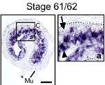 mxd1 (MAX dimerization protein 1) gene expression in the intestine of Xenopus laevis embryo, assayed via in situ hybridization, NF stage 61/62, in cross-section.