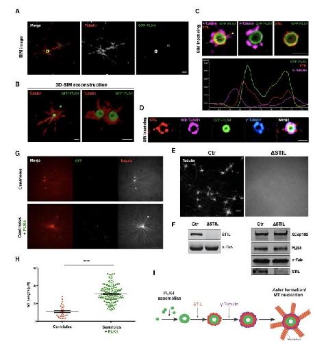 STIL (red), -tubulin (magenta) and GFP-PLK4 (green) within PLK4 MTOCs. Scale bars: 1 µm. (Movie 4) (D)