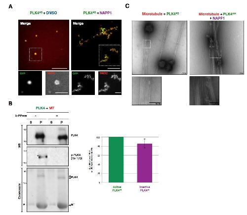 forms disorganized structures. (E) EM images of GFP-PLK4AS in the presence or absence of NAPP1. Scale