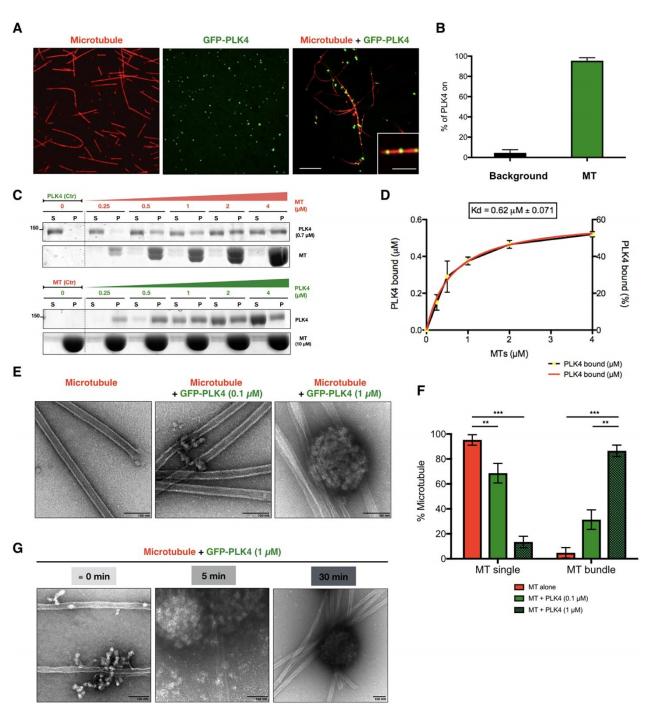 each; (***P<0.001; **P<0.01). (G) Time course of PLK4 (1 µM) incubated with MTs. Note that PLK4 binds