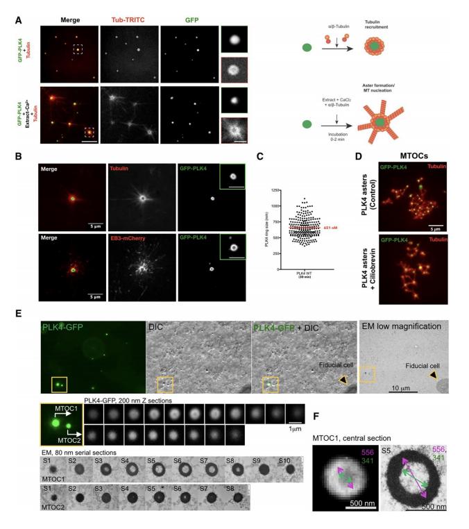 GFP-PLK4 rings were measured from 3 independent experiments. (D) PLK4 asters are independent of