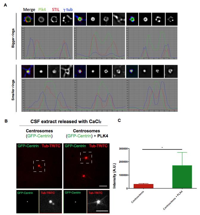 interphasic extract in the presence or absence of GFP-PLK4 (rhodamine-labelled tubulin (red); centriole