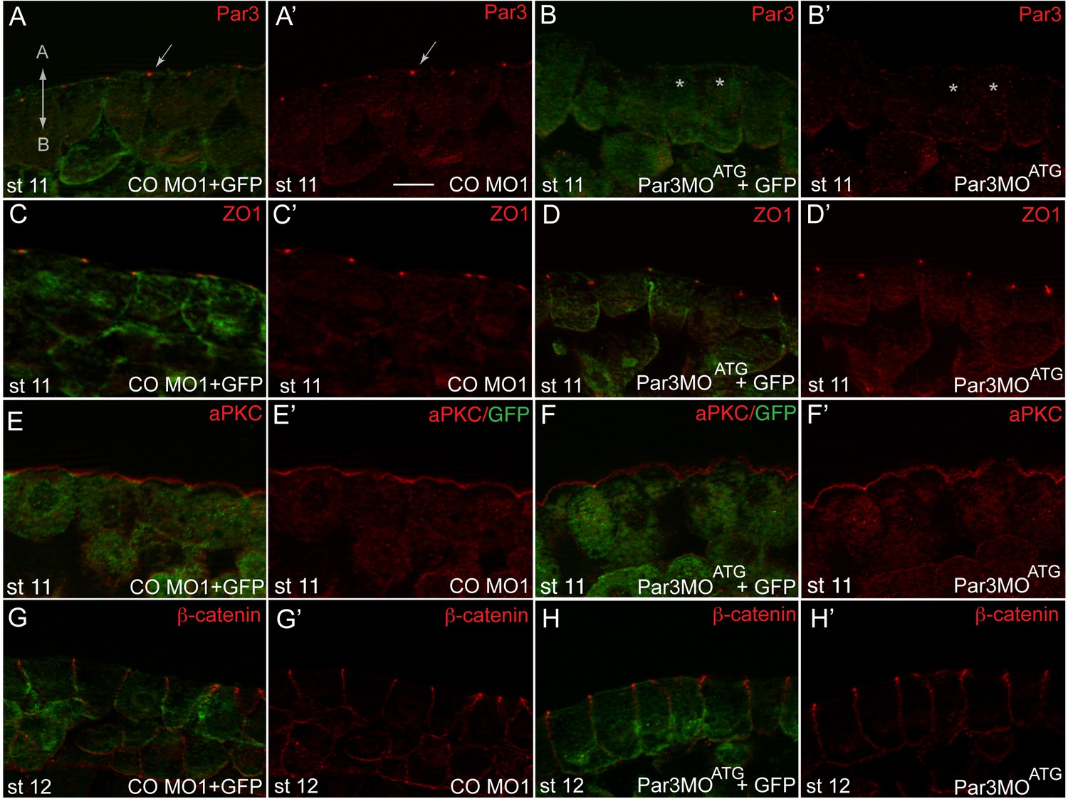 Figure 2âfigure supplement 3 Par3 depletion does not affect the localization of aPKC, b-catenin and ZO1 in gastrula ectoderm. Early embryos were injected with control morpholino (CO MO1) or Par3MOATG (20 ng each) and GFP RNA (100 pg) as a lineage tracer, cultured until stage 11 or stage 12, sectioned and stained for junctional, polarity markers and GFP as indicated. CO MO1 has no effect on (A) Par3 (arrow), (C) ZO1, (E) aPKC and (G) b-catenin. (B, D, F, H) Par3MOATG reduced levels of (B) Par3 (asterisks), but not (D) ZO1, (F) aPKC or (H) b-catenin. (AâH) merged images showing co-staining with GFP. Scale bar, 20 µm. Apicobasal (AâB) axis is indicated. Images are representative of 3 independent experiments, each containing 15â20 embryos per group. |