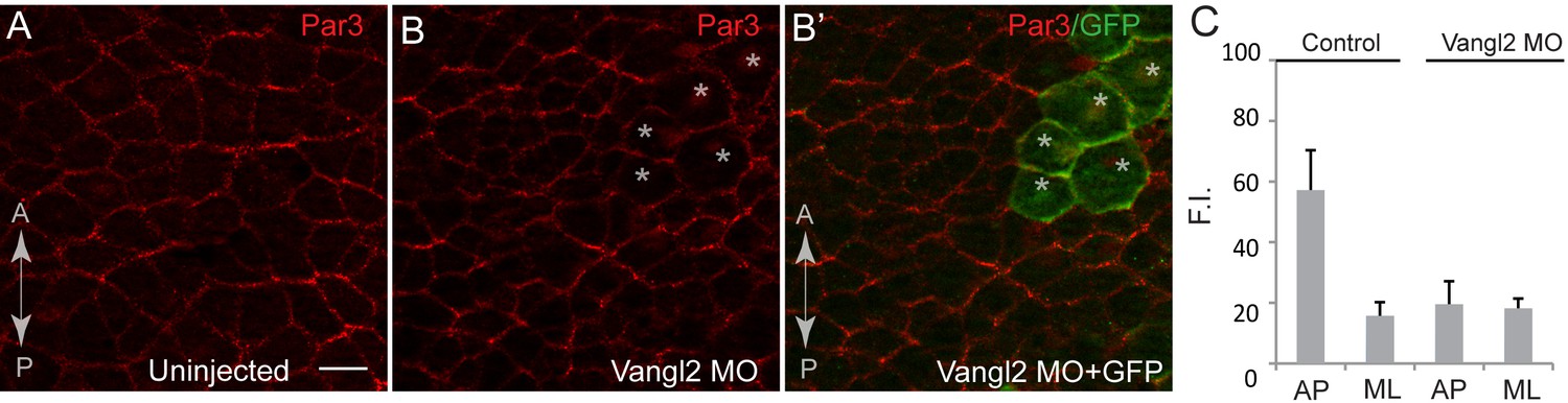 Figure 2âfigure supplement 4 Planar polarity of Par3 is lost in Vangl2-depleted cells in the neural plate. (A, B) En face view of immunostained neural plate explants from fixed Xenopus embryos at stages 15/16. The anteroposterior (AP) axis is shown. (A) Par3 is enriched at the anteroposterior cell borders in untreated cells. (B, Bâ) Polarization of Par3 at the anteroposterior cell borders is no longer detected in Vangl2 MO injected cells (asterisks). (C) Results are shown as means ± s. d., with each group containing ten embryos. At least 15 cells from two embryos were analyzed per group. F.I., Fluorescence intensity. The experiment was repeated two times. Scale bar, 20 µm. |