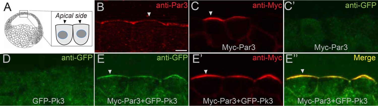 Figure 6. Par3 recruits Pk3 to the apical side of the cell in vivo.Embryos were injected with GFP-Pk3 and Myc-Par3 RNAs (100 pg each), cryosectioned at stage 10.5 and immunostained with indicated antibodies (A) Scheme showing a relative position of imaged superficial ectoderm cells. Both endogenous Par3 (B), and exogenous Myc-Par3 (C, Eâ, Eââ) are apically localized. (Câ) Lack of Myc-Par3 staining with anti-GFP antibody. (D) Lack of apical enrichment of exogenous GFP-Pk3. (EâEââ) Myc-Par3 recruits GFP-Pk3 to the apical surface. (B, C, E) Apical enrichment is shown by arrowheads. The apical recruitment of Pk3 was observed in > 90% of cells coinjected with Pk3 and Par3. Each group contained five embryos. The same results were obtained in five independent experiments. Scale bar 10 µm.Figure 6âfigure supplement 1. Par3 recruits Pk3 but not Dvl2 to the apical cell membrane.8â16 cell Xenopus embryos were injected animally with 100 pg of the RNAs encoding GFP-Pk3 (Pk3), HA-RFP-Pk3, GFP-Dvl2, Myc-Par3 and Myc-Par1T560A as indicated, cultured until stage 10.5, cryosectioned and immunostained for GFP (A, B, EâG), HA (C, D) or Myc (H). Myc-Par3 recruits GFP-Pk3 (A, B), but not GFP-Dvl2 (E, F), to the apical membrane. (C, D) Myc-Par3 promotes the apical localization of HA-RFP-Pk3. (G) Myc-Par1T560A does not promote GFP-Pk3 apical localization. (H) Myc-Par1T560A is cortically localized. Scale bar, 10 µm. The apical recruitment of Pk3 was observed in the majority (>90%, n > 100) of cells co-expressing Pk3 and Par3, but not in cells expressing Pk3 alone. |