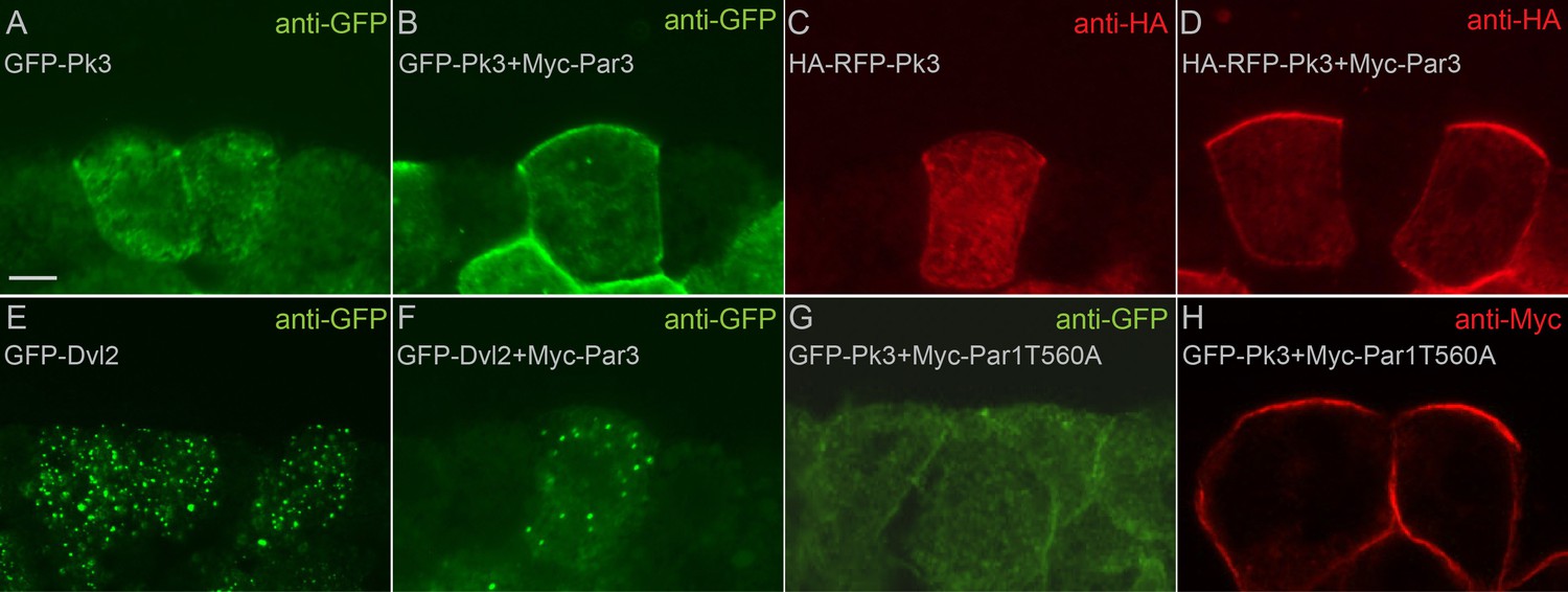 Figure 6—figure supplement 1 Par3 recruits Pk3 but not Dvl2 to the apical cell membrane. 8–16 cell Xenopus embryos were injected animally with 100 pg of the RNAs encoding GFP-Pk3 (Pk3), HA-RFP-Pk3, GFP-Dvl2, Myc-Par3 and Myc-Par1T560A as indicated, cultured until stage 10.5, cryosectioned and immunostained for GFP (A, B, E–G), HA (C, D) or Myc (H). Myc-Par3 recruits GFP-Pk3 (A, B), but not GFP-Dvl2 (E, F), to the apical membrane. (C, D) Myc-Par3 promotes the apical localization of HA-RFP-Pk3. (G) Myc-Par1T560A does not promote GFP-Pk3 apical localization. (H) Myc-Par1T560A is cortically localized. Scale bar, 10 µm. The apical recruitment of Pk3 was observed in the majority (>90%, n > 100) of cells co-expressing Pk3 and Par3, but not in cells expressing Pk3 alone. |