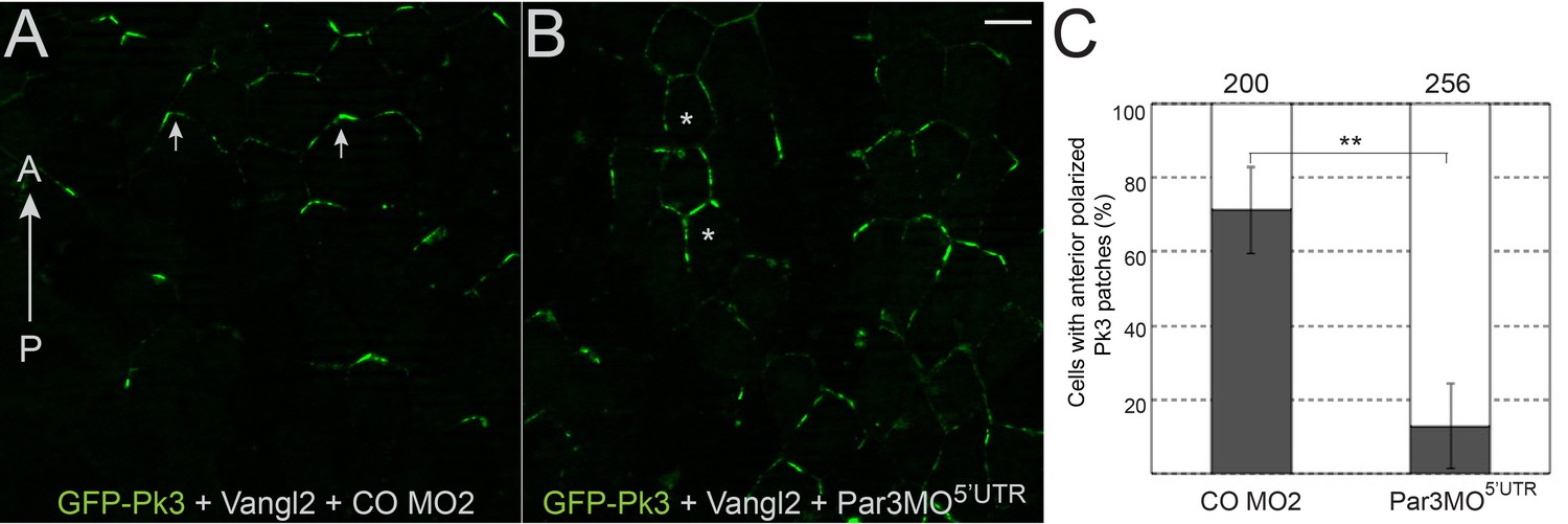 Figure 7âfigure supplement 2 Par3 depletion disrupts the polarization of Pk3-Vangl2 complexes in the neural plate. (A, B) Par3 depletion disrupts neuroepithelial PCP. Two dorsal blastomeres of 16 cell embryos were injected with GFP-Pk3 RNA, 100 pg, HA-Vangl2 RNA, 25 pg, and CO MO2 or Par3MO5âUTR, 10 ng each. Injected embryos were cultured until stage 14, fixed and imaged. (AâB) Representative images of the neural plates. (A) Anterior enrichment of Pk3/Vangl2 complexes (arrows) in a CO MO2 injected embryo. (B) Lack of PCP (asterisks) in a Par3MO5âUTR-injected embryo. Scale bar, 20 µm. (C) Frequencies of neuroepithelial cells containing polarized Pk3 cortical patches. 7 to 40 cells were scored per embryo with three embryos per each group. Means ± s. d. represent three independent experiments. Total numbers of scored cells are above each bar. Significance was determined by the two-tailed Studentâs t-test, p<0.01 (asterisks). |