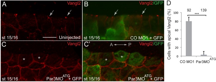 Figure 2âfigure supplement 2 Par3MOATG inhibits apical accumulation of Vangl2 at the neural plate midline. Sagittal sections of stage 15/16 embryos were immunostained with anti-Vangl2 and anti-GFP antibody. The anteroposterior (AP) axis is indicated. Apical surface is at the top. (A, B) Vangl2 is enriched at the apical corners of cells at the neural midline in uninjected and CO MO1-injected embryos (arrows). (C, Câ) Basolateral localization of Vangl2 at the cell junctions of Par3MOATG-injected embryos (asterisks). (D) Quantification of apical Vangl2 staining in CO MO1 and Par3MOATG-injected tissue. Number of counted cells is shown above the bars. Error bars represent standard deviation. Significance was determined by the two-tailed Studentâs t-test, p<0.001 (asterisks). Scale bar, 20 mm. |