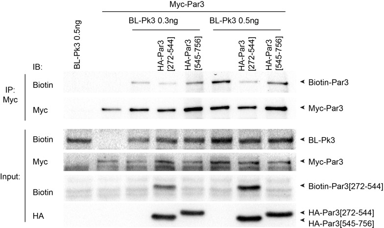 Figure 5—figure supplement 1. Interaction of Pk3 and Par3 in Xenopus embryos is inhibited by Pk3 binding fragment of Par3.Interaction of Par3 and Pk3 was assessed by proximity biotinylation. Biotin and RNAs encoding FLAG-BL-Pk3, with or without Myc-Par3 RNA, 0.1 ng, and HA-Par3[272-544] or HA-Par3[545-756] were injected into the animal region of four- to-eight-cell embryos. Injected embryos were lysed at stage 13 for immunodetection of biotinylated proteins. Levels of Par3 biotinylation were assessed in Myc pulldowns. Biotinylation of HA-Par3[272-544] and HA[545-756] constructs was compared in embryo lysates. Only HA-Par3[272-544] was biotinylated. Protein levels are shown by immunoblotting with anti-biotin, anti-Myc and anti-HA antibodies. |