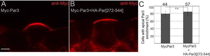 Figure 5âfigure supplement 2. Par3[272-544] construct does not affect Par3 localization.(AâC) Four animal blastomeres of 16 cell embryos were injected with Myc-Par3 RNA, 70 pg with or without 0.5 ng of HA-Par3[272-544] RNA. Injected embryos were cultured until stage 11, cryosectioned and immunostained for Myc (A, B). (A, B) Myc-Par3 with is enriched at the apical membrane. Scale bar, 10 µm. (C) Quantification of data in (A, C) shown as mean frequencies ± s. d. of superficial ectoderm cells with apically enriched Myc-Par3. Total numbers of scored cells are shown above each bar; 13 to 26 cells were scored per embryo with three embryos taken for each experimental condition, statistical difference determined by two-tailed Studentâs t-test was not significant, p>0.05. Data are representative of two experiments. |