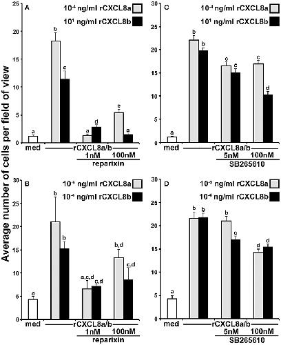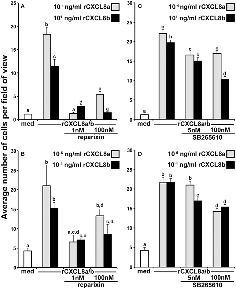 Figure 5. Roles of the frog CXCR1 and CXCR2 in the rCXCL8a- and rCXCL8b-elicited chemotaxis. (A) Tadpole and (B) adult frog granulocytes (105 cells/well) were subjected to chemotaxis assays in absence or presence of 1 nM or 100 nM of the CXCR1/CXCR2 inhibitor, reparixin and using the respectively most chemo-attractive concentrations of rCXCL8 or rCXCL8b. Cells from three individual animals were used for each chemokine concentration (N = 3). (C) Tadpole and (D) adult frog granulocytes (105 cells/well) were subjected to chemotaxis assays in absence or presence of 5 or 100 nM of the CXCR2 inhibitor, SB265610 and using the respectively most chemo-attractive doses of rCXCL8 or rCXCL8b. Cells from four individual animals were used for each chemokine concentration (N = 4). All results are presented as means + SEM. Above-head letters denote statistical designations: experimental groups described by distinct letters are statistically different (P < 0.05) while those marked by the same letters are not.