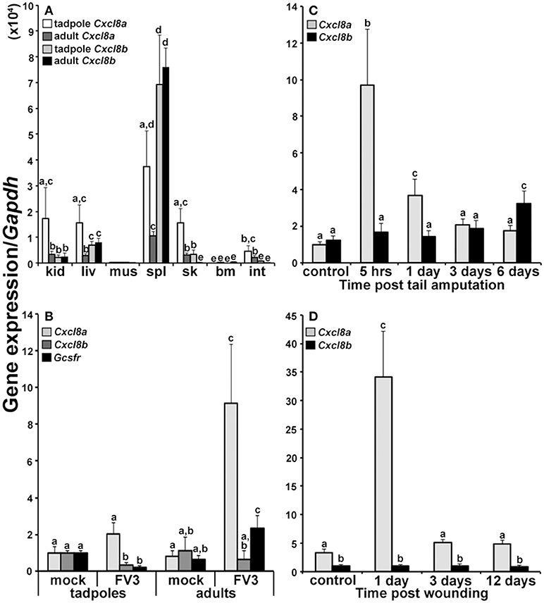 Figure 2. Analyses of Cxcl8a and Cxcl8b gene expression in healthy and immune challenged animals. (A) Cxcl8a and Cxcl8b gene expression in tadpole and adult kidney (kid), liver (liv), muscle (mus), spleen (spl), skin (sk), bone marrow (bm), and intestine (int) tissues (N = 6). (B) Cxcl8a, Cxcl8b, and Gcsfr gene expression in tadpole and adult kidneys 3 days post FV3 infection (104 PFU/tadpole; 5 Ã 106 PFU/adult) (N = 5). (C) Cxcl8a and Cxcl8b gene expression in amputated tadpole tails (N = 5). (D) Cxcl8a and Cxcl8b gene expression in adult frog hind leg skin wounds (N = 5). All gene expression was compared relative to Gapdh control and all results are presented as means + SEM. Above-head letters denote statistical designations: experimental groups described by distinct letters are statistically different (P < 0.05) while those marked by the same letters are not.