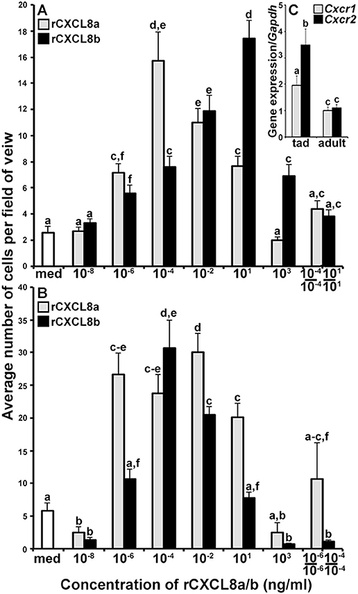 Figure 4. The rCXCL8a and rCXCL8b elicit distinct chemotaxis responses in tadpole and adult granulocytes. (A,B) Medium or increasing concentrations of rCXCL8a or rCXCL8b were loaded into bottom chemotaxis chamber wells and (A) tadpole or (B) adult frog granulocytes (105 cells/well) were loaded into top wells, separated by 5 μm pore filters. After 3 h of incubation, the filters were stained with Giemsa, mounted bottom side up and the numbers of migrating cells per field of view enumerated. Cells from three individual animals were used for each chemokine concentration (N = 3) and the highest tadpole (10â4 ng/ml of rCXCL8a; 101 ng/ml of rCXCL8b) and adult frog (10â6 ng/ml of rCXCL8a; 10â4 ng/ml of rCXCL8b) granulocyte chemotactic activities were confirmed in two additional, independent experiments and the results combined and presented here (N = 9). Chemokinesis was measured by adding respective concentrations of rCXCL8 or rCXCL8b that elicited maximal cell migration, to both lower and upper chambers. (C) Tadpole and adult frog gene expression of Cxcr1 and Cxcr2 relative to Gapdh. All results are presented as means + SEM. Above-head letters denote statistical designations: experimental groups described by distinct letters are statistically different (P < 0.05) while those marked by the same letters are not.