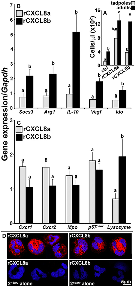 Figure 6. Analysis of immune gene expression and cytology of rCXCL8a- and rCXCL8b-elicited tadpole cells. Tadpoles and adult frogs were injected intraperitoneally with rCXCL8a or rCXCL8b (1 μg/g of body weight) in 10 μl of saline or with an equal volume of the vector control (supernatants from empty vector-transfected Sf9II cell, processed in parallel to rCXCL8a and rCXCL8b production). After 4 h, animals were lavaged with saline and the cells were enumerated (A). The tadpole (B,C) and adult frog (not presented) rCXCL8a and rCXCL8b-elicited cell immune gene expression was examined relative to the Gapdh control (N = 6). All results are presented as means + SEM. Above-head letters denote statistical designations: experimental groups described by distinct letters are statistically different (P < 0.05) while those marked by the same letters are not. (D) Tadpole rCXCL8a and rCXCL8b-elicited cells were stained with a rabbit anti-frog rG-CSFR (or saline) Ab and secondary goat anti-rabbit Ab and examined by confocal microscopy.
