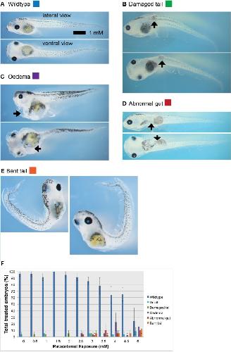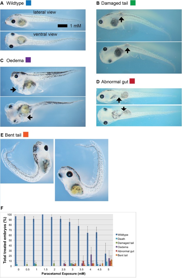 Xenopus laevis embryos were exposed to a paracetamol concentration in the range 0-5âmM (nâ=â4). The embryos were exposed to paracetamol from stage 38 and harvested at stage 45. Phenotypes include wildtype (A), damaged tail (B), oedema (C), abnormal gut (D) and bent tail (E). The surviving embryos at stage 45 were photographed and the different phenotypes found for each paracetamol concentration were calculated as a percentage of total embryos tested (F). Where possible, the embryos were photographed to show the lateral view and the ventral view. Scale bar represents 1âmm.