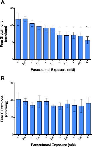 RESULTS: The amount of free GSH decreased significantly in embryos exposed to increasing paracetamol concentration. In embryos exposed to 5 mM paracetamol, 22.57 ± 4.25 nmol/mg GSH was detected compared to 47.11 ± 7.31 nmol/mg untreated embryos (mean ± SEM). In tailtissue, miRNA-122 expression increased 6.3-fold with 3 mM paracetamol concentration treatment compared to untreated embryos. NAC treatment altered the free GSH decline for embryos treated with up to 5 mM. Embryos exposed to 1 mM paracetamol and then exposed to 0.5 mM NAC 24 h prior to harvest, had a significantly higher amount of GSH compared to embryos that were only exposed to 1 mM paracetamol (mean ± SEM; 97.1 ± 9.6 nmol/mg and 54.5 ± 6.6 nmol/mg respectively).
