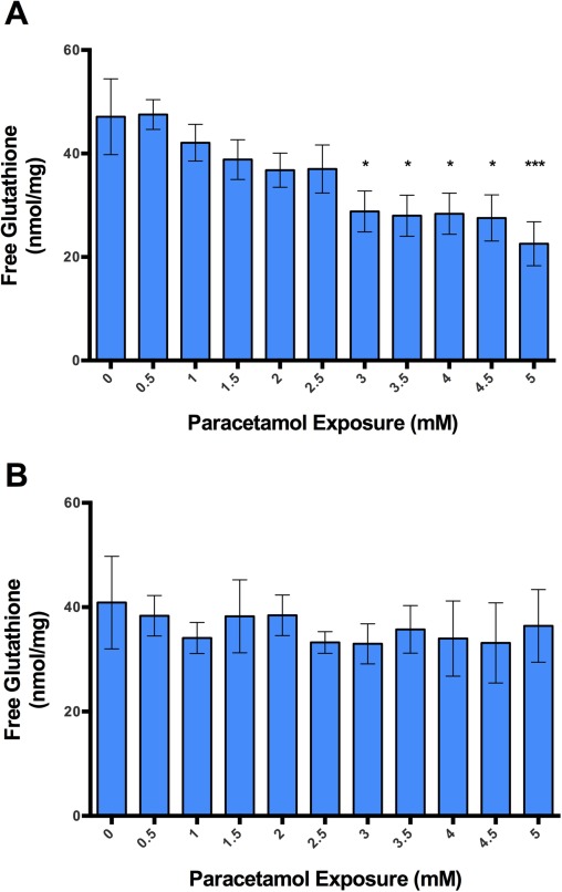 Xenopus laevis embryos were exposed to 0-5 mM paracetamol from the age of stage 38, and harvested at stage 45 (A, n = 10) or at stage 41 (B, n = 3). The amount of free GSH (nmol/mL) was measured inside the embryos and normalised to the amount of protein (mg/mL). An ordinary one-way ANOVA compared each exposure group to the group exposed to Xenopus media alone (0 mM). For the embryos exposed until stage 45 (A), the amount of free GSH for 3, 3.5, 4 and 4.5 mM paracetamol exposure groups was statistically significant compared to the group exposed to Xenopus media only (P < 0.05). The 5 mM paracetamol exposure group was also statistically significantly different (P < 0.01). There was no significant difference between treated and untreated embryos that were harvested at stage 41 (B).