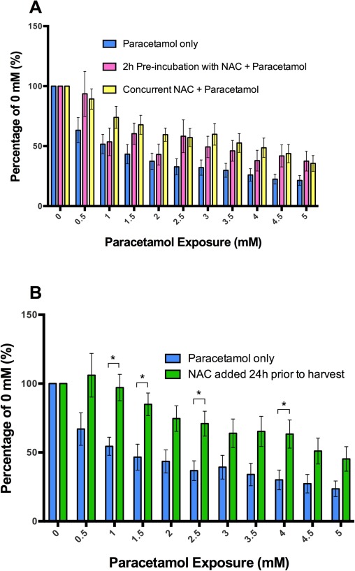 Stage 38 embryos were exposed to paracetamol (up to 5 mM) for 72 h with or without the addition of 0.5 mM NAC, they were harvested at stage 45. For the initial experiments (A) there were 3 conditions: exposure to paracetamol alone (blue), 2 h incubation with NAC prior to the addition of paracetamol (pink) and concurrent treatment with NAC and paracetamol (yellow) (n = 10). The embryos were also exposed to APAP from stage 38 and then with NAC for 24 h prior to harvest (green) at stage 45, a 72 h incubation period, or with paracetamol alone (blue) (B) (n = 5). The amount of free GSH inside the embryos was measured and normalised to the amount of protein. This value was then normalised to the embryos exposed to Xenopus media alone (0 mM). The amount of free GSH measured was calculated as a percentage of the 0 mM paracetamol exposure group (±SEM). A multiple comparison 2 way ANOVA was performed to measure the statistical significance between groups of them same paracetamol exposure, with and without additional NAC exposure (P < 0.05).