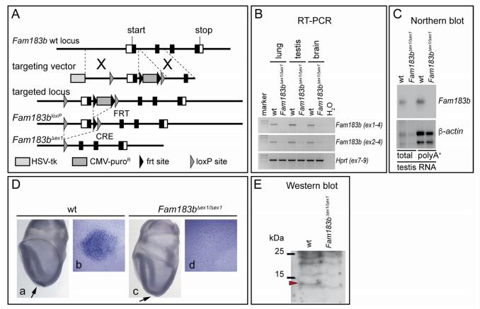 Figure 4. Generation and validation of a Fam183b-null allele. (A) Schematic drawing depicting the structure