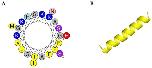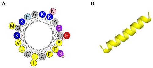 Figure 1. Structure analysis of magainin 2. (A) Helical wheel diagram of the peptide. The projection was obtained from http://heliquest.ipmc.cnrs.fr/cgibn/ComputParam.py. Positively charged residues are represented in blue, while hydrophobic residues are shown as yellow circles. The N-terminal and C-terminal parts are represented in red letters âNâ and âCâ. (B) Three-dimensional structure of magainin 2.