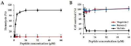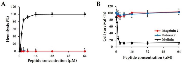 Figure 3. Cytotoxicity and hemolytic activity of magainin 2. (A) Hemolytic activity of peptides against mouse red blood cells (RBCs). (B) Cytotoxicity of peptides against HaCaT cells.
