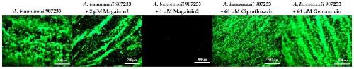 Figure 6. Biofilm reduction assay. (A) Degree of biofilm removal by magainin 2, ciprofloxacin, and gentamicin using crystal violet staining. (B) Image of removed biofilm after treatment with 256 µM of peptide and antibiotics. (C) SYTO9-stained biofilm image.