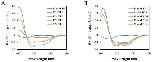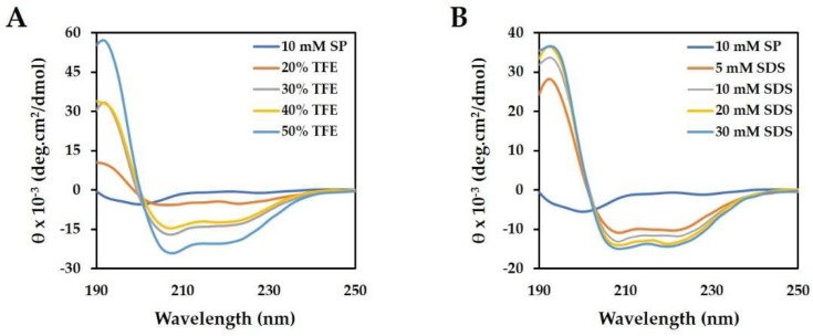 Figure 2. Circular dichroism (CD) spectra of magainin 2. (A) The peptide was measured in TFE, which mimics the hydrophobic environment of the microbial membrane and (B) SDS, which mimics the negatively charged prokaryotic membrane environment.