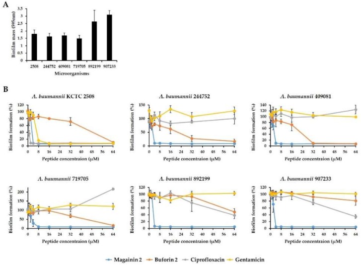 Figure 4. Effect of Acinetobacter baumannii biofilm formation by magainin 2. (A) Quantitative measurements of biofilm formation using crystal violet staining. (B) Inhibitory effect of peptides on biofilm formation. Antibiotics (ciprofloxacin and gentamicin) and buforin 2 were used as controls.