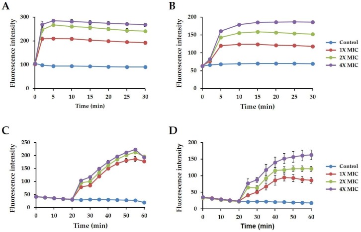 Figure 7. Magainin 2 mechanism of action. (A,B) The outer membrane permeability of magainin 2 was measured using NPN dye. (C,D) Depolarization of cytoplasmic membrane induced by magainin 2, determined using the membrane potential-sensitive fluorescent dye DisC3-5. (A,C: Acinetobacter baumannii KCTC 2508, B,D: Acinetobacter baumannii 907233).