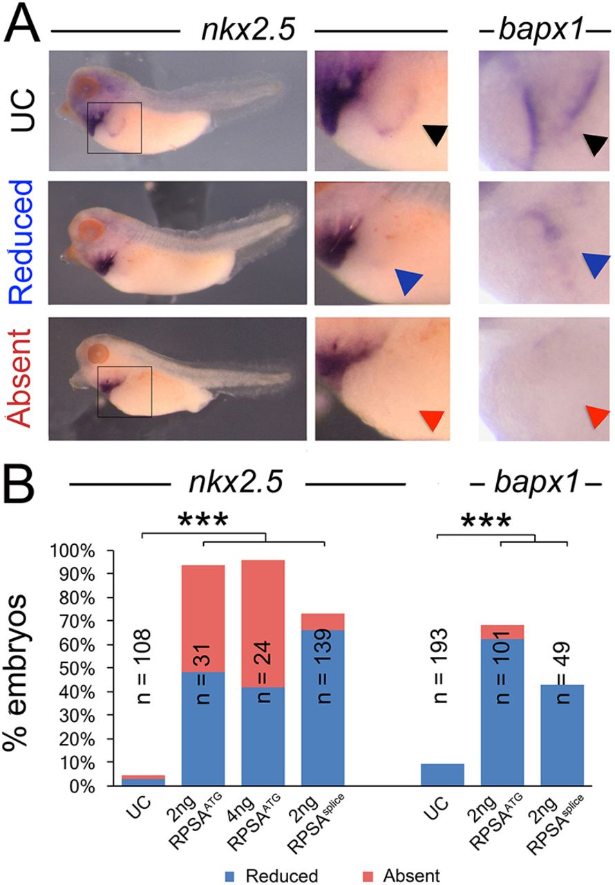 Fig. 2. Depletion of Rpsa using either a translation (RpsaATG) or splice (RpsaSplice) blocking morpholino impairs expression of nkx2-5 and bapx1 in the spleen of stage 38 rpsa morphants. (A) Representative images of the expression phenotype. Middle and right panels are magnifications of the spleen region marked by a box in the left panel. Black arrowheads indicate normal expression. Blue arrowheads indicate reduced expression. Red arrowheads indicate lack of expression. (B) The percentage of embryos with reduced or absent nkx2-5 or bapx1 expression in the developing spleen following rpsa depletion. ***Pâ¤0.0001 (two-tailed Fisher's exact test). |