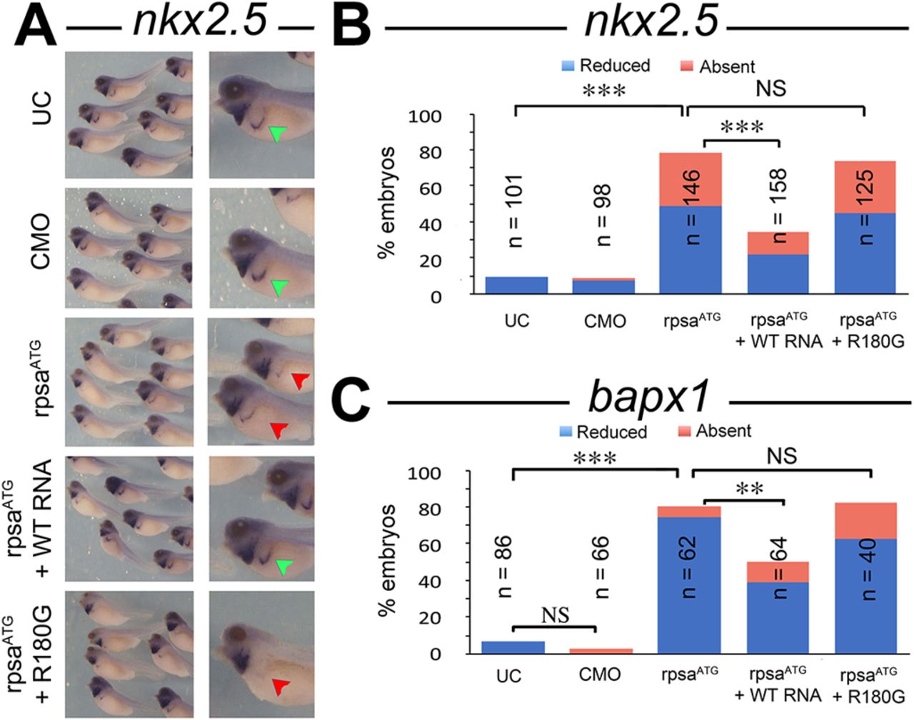 Fig. 3. The human R180G mutation is detrimental to function. (A) Representative images of nkx2-5 expression in the spleen anlage of stage 38 embryos. Depletion of Rpsa causes a severe reduction of nkx2-5 expression, which can be ameliorated by injection of human WT RPSA mRNA but not by injection of R180G mutated mRNA. Green arrowheads highlight robust expression; red arrowheads indicate reduced expression. (B,C) The percentage of embryos with reduced or absent nkx2-5 (B) or bapx1 (C) expression. **P<0.001, ***P<0.0001 (two-tailed Fisher's exact test). CMO, control morpholino; rpsaATG, translation-blocking MO; NS, not significant; UC, uninjected control. |