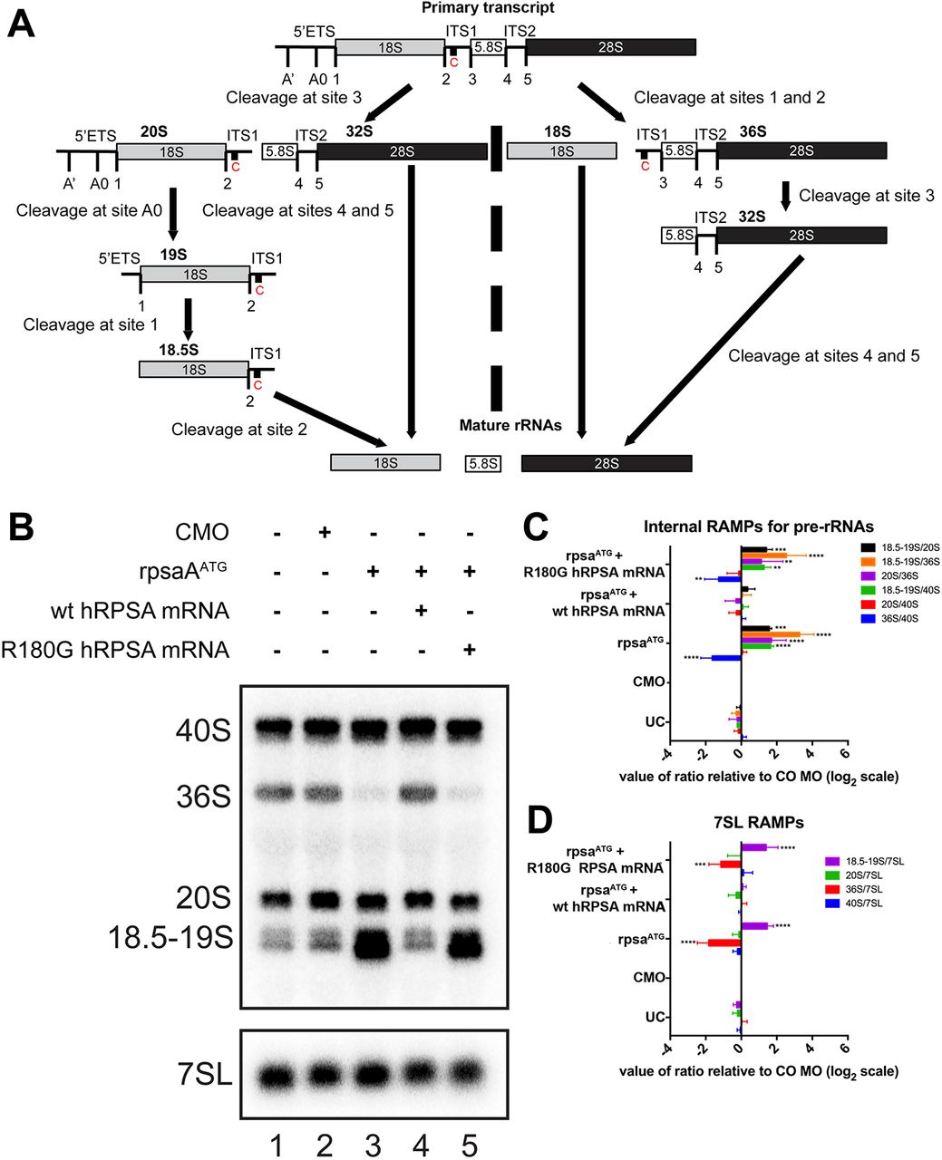 Fig. 4. Rpsa is required for pre-rRNA processing. (A) Diagram of pre-rRNA processing pathways in X. tropicalis. The primary transcript pre-rRNA undergoes several nucleolytic cleavages to produce the mature 18S, 5.8S and 28S rRNAs. c (red), position of the northern blot probe; ETS, external transcribed spacers; vertical lines indicate cleavage sites. (B-D) Depletion of Rpsa causes pre-rRNA processing defects that are rescued by WT human RPSA (hRPSA) but not by ICA-mutated RPSA mRNA (R180G). Stage 38 X. tropicalis pre-rRNAs isolated from pools of 10-15 whole embryos were detected by northern blotting (B). The 7SL RNA was used as a loading control. +, injection; â, no injection. (C) RAMP quantitation of the ratios of pre-rRNAs relative to each other. (D) RAMP quantitation of the pre-rRNAs relative to the 7SL loading control. Data are mean+s.d. for four independent biological replicates. **Pâ¤0.01, ***Pâ¤0.001, ****Pâ¤0.0001 (two-way ANOVA with Tukey's multiple comparisons test). CMO, control morpholino; rpsaATG, translation-blocking MO; UC, uninjected control. |
