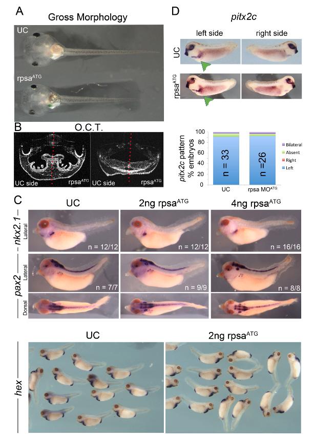 Fig. S1 Rpsa depletion does not affect development of other early developmental processes examined. A) Gross morphology of stage 45 control and rpsa depleted embryos. B) Optical coherence tomography of the craniofacial cartilages of stage 45 tadpoles injected with rpsa MO in one cell at the two cell stage, allowing comparison with the uninjected control side of the embryo. No significant differences were detected. C) Expression of nkx2.1, pax2 and hex is unaffected by depletion of rpsa. D) The laterality gene pitx2c is normally expressed in the left lateral mesoderm of rpsa morphants at stage 28 (green arrowheads). |