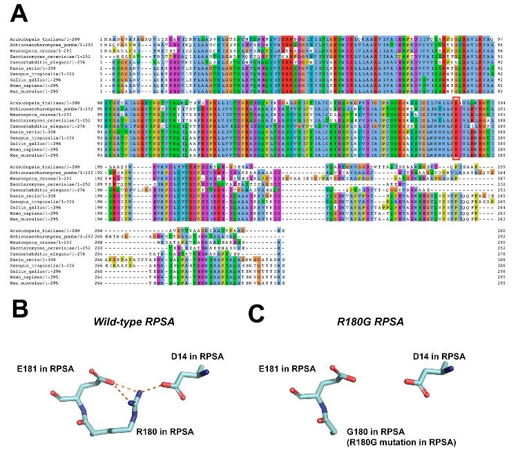 Fig. S3 The R180G disease variant. A) Alignment of RPSA amino acid sequence across selected metazoan species. Note that R180 (red box) is conserved. B) Structural model of the R180 residue in WT human RPSA using PyMol. R180 in wild-type human RPSA is shown with its predicted polar contacts with D14 and E181 in RPSA. Orange dotted lines indicate polar contacts. C) Substitution of R180 with a glycine (R180G) is predicted to abolish these interactions, likely destabilizing the protein’s tertiary structure. |