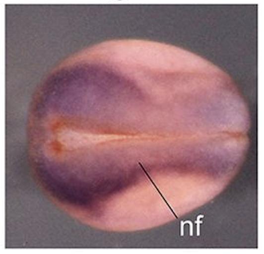 Fig. 1. rpsa is dynamically expressed in development. (A,B) Both in situ hybridization (A) and ultra-high temporal resolution RNA-seq analysis (B) reveal low levels of rpsa transcripts prior to stage 12 in X. tropicalis. Expression increases throughout subsequent stages and is primarily associated with the developing neural folds (nf), brain (b), cranial neural crest (cnc) and ventral mesoderm/blood islands (vm/bl). Expression is also diffusely detected in the lateral mesoderm (lm) where the spleen will form. pa, pharyngeal arches. |