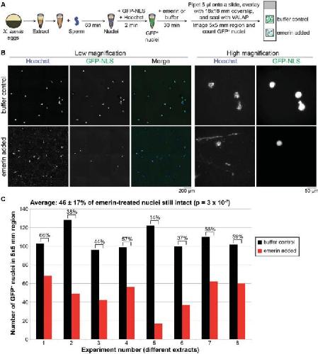 FIGURE 1:. Emerin induces breakage of X. laevis egg extract nuclei. (A) Experimental approach. See Materials and Methods for further details. (B) Representative images of nuclei treated with dialysis buffer or 5 nM recombinant emerin. (C) Quantification of the nuclear breakage phenotype. The intact GFP+ nuclei were counted for buffer- or emerin-treated nuclei in eight different X. laevis egg extracts. Above each pair of bars is the percentage of intact emerin-treated nuclei compared with the buffer control. Above the graph is the average of all data. |