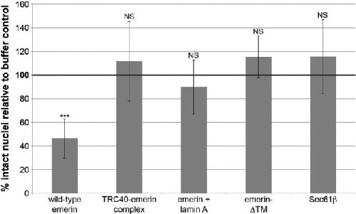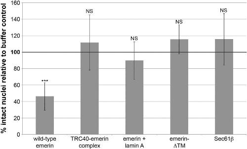 FIGURE 3: Rescue of nuclear breakage. Experiments and quantification were performed as in Figure 1. Data are plotted as the mean and SD from multiple independent experiments. The wild-type emerin data are the same as presented in Figure 1C (n = 8 extracts). TRC40-emerin was added at 5 nM (n = 6 extracts). For the âemerin + lamin A experiment,â recombinant lamin A was added during nuclear assembly at 1 nM before the addition of 5 nM emerin (n = 5 extracts). The emerin-ÎTM protein (deletion of transmembrane domain amino acids 228â242) was added at 5 nM (n = 4 extracts). The Sec61β protein was added at 5 nM (n = 2 extracts), and 50 nM Sec61β also did not induce nuclear breakage (unpublished data). Across all experiments, the average number of intact nuclei for buffer controls was 240. Statistical analysis was performed relative to the buffer control, which was normalized to 100% intact nuclei (bold horizontal line). ***p < 0.005; NS, not significant. |