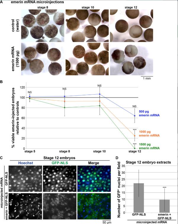 FIGURE 6:. Microinjected emerin mRNA induces loss of nuclear integrity and death in X. laevis embryos. (A) One-cell embryos were microinjected with 1500 pg of emerin mRNA (dissolved in water) or an equivalent volume of water as a control and allowed to develop. Representative images at different developmental stages are shown. (B) One-cell embryos were microinjected with the indicated amounts of emerin mRNA or an equivalent volume of water as a control and allowed to develop. At the indicated developmental stages, the viable embryos were counted. Inviable embryos were those that had stopped dividing or exhibited a puffy white appearance indicative of apoptosis (Johnson et al., 2010; Du Pasquier et al., 2011; Tokmakov et al., 2011; Gillespie et al., 2012; Willis et al., 2012; Iguchi et al., 2013; Broadus et al., 2015). The number of viable embryos was normalized to water-microinjected controls. From 11 to 89 embryos were analyzed per condition per experiment (43 embryos on the average). Averages from three independent experiments are shown. Error bars represent SD. Statistical analysis was performed relative to the water-microinjected control embryos. ***p < 0.005; NS, not significant. Injection with 100 pg emerin mRNA had no effect on embryo viability, and 2000 pg emerin mRNA exerted an effect similar to 1500 pg (unpublished data). (C) One-cell embryos were microinjected with 1000 pg GFP-NLS mRNA with or without 1500 pg emerin mRNA and allowed to develop. When control embryos reached stage 12, nuclei in microinjected embryos were visualized with Hoechst and GFP-NLS. Representative images from one experiment out of two are shown. (D) When control embryos reached stage 12, extracts were prepared from equivalent numbers of microinjected embryos described in C. Equivalent volumes of extract were supplemented with Hoechst, applied to a slide, overlaid with a coverslip, and incubated for 15 min. Images were acquired and the intact GFP+ nuclei per â¼660 à 660 µm field were counted. Nuclei from at least six fields were counted per experiment and condition. Averages from two independent experiments are shown. Error bars represent SD. ***p < 0.005. |