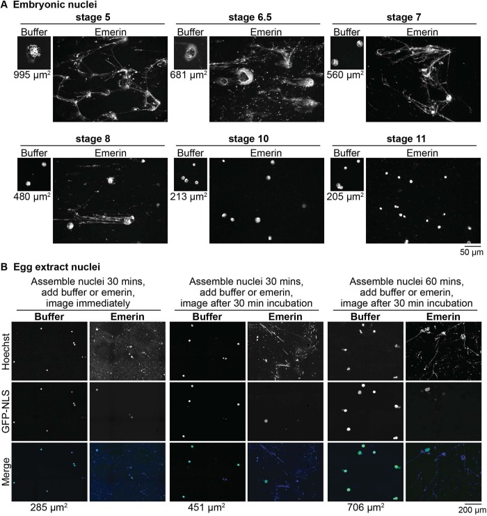FIGURE 4: Early stage X. laevis embryonic nuclei are susceptible to emerin-induced breakage. (A) Embryo extracts containing endogenous embryonic nuclei were prepared from different-stage X. laevis embryos. At least 30 embryos were used per extract. Extracts were supplemented with 5 nM emerin or an equivalent volume of dialysis buffer as a control and incubated at room temperature for 30 min. Nuclei were stained with Hoechst and visualized as in Figure 1. Representative images from one experiment out of three are shown. Average nuclear cross-sectional area at each developmental stage is indicated in µm2 (Jevtic and Levy, 2015). (B) Experiments were performed with X. laevis egg extract as in Figure 1, except that the lengths of nuclear assembly and emerin incubation were varied as indicated, so that the nuclei were different sizes when emerin was added. Representative images from one experiment out of three are shown. Average nuclear cross-sectional area for each condition is indicated in µm2. |