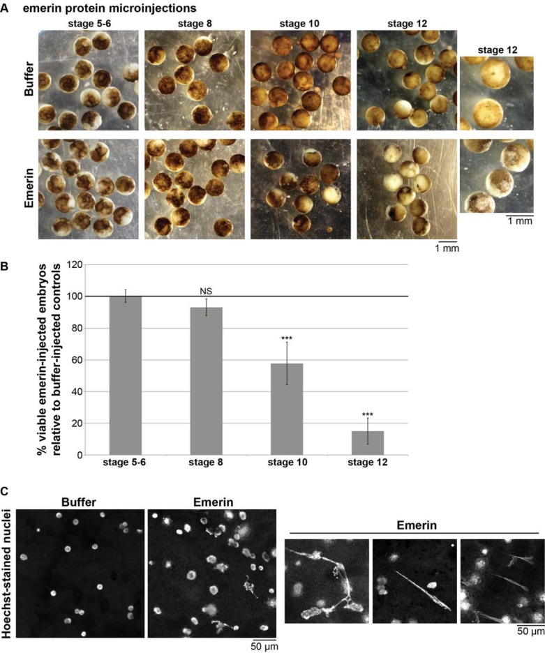 FIGURE 5:. Microinjected emerin protein induces nuclear breakage and death in X. laevis embryos. (A) One-cell embryos were microinjected with emerin to achieve a final concentration of 0.5 nM within the embryo or an equivalent volume of dialysis buffer and allowed to develop at room temperature. Representative images at different developmental stages are shown. (B) At the indicated developmental stages, the viable embryos were counted. Inviable embryos were those that had stopped dividing or exhibited a puffy white appearance indicative of apoptosis (Johnson et al., 2010; Du Pasquier et al., 2011; Tokmakov et al., 2011; Gillespie et al., 2012; Willis et al., 2012; Iguchi et al., 2013; Broadus et al., 2015). The number of viable embryos was normalized to the buffer control. From 30 to 60 embryos were analyzed per condition per experiment. Averages from three independent experiments are shown. Error bars represent SD. Statistical analysis was performed relative to the stage 5â6 embryos. ***p < 0.005; NS, not significant. (C) Nuclei in buffer- or emerin-microinjected embryos were visualized with Hoechst at stage 12. Representative images from one experiment out of three are shown. |
