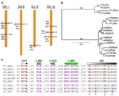 Figure 1. Zebrafish family of glycine receptors (GlyR). (A) Chromosomal (Chr) arrangement of zebrafish GlyR (zGlyR) subunits. Location (in Mbp) are on the right, while name of subunit, length and sequence similarity to human ortholog are given to the left. (B) Phylogenetic analysis of zGlyR subunits. Horizontal scale bar at the bottom reflects amount of genetic change, all other numbers are bootstraps. (mGlyR and hGlyR) mouse and human GlyR subunit. (C) Sequence alignments of zGlyRα subunits to hGlyRα1, and zGlyRà subunits to hGlyRÃ. Red letters indicate residues conserved among α and à subunits from zebrafish and human. Blue letters indicate residues conserved between zGlyRà paralogs which differ from hGlyRÃ. Magenta letters indicate residues conserved between α and à subunits from zebrafish and human. AD1: assembly domain one, (â)BD and (+)BD: negative and positive faces of the inter-subunit binding sites for glycine and strychnine, M2: transmembrane domain 2. Numbered residues (â) indicate position with M2.