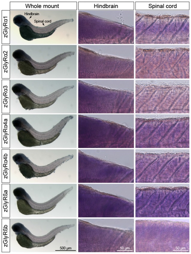 Figure 3. Whole-mount in situ hybridizations of zGlyR subunits from 48 hours post-fertilization (hpf) larvae. Individual subunits are indicated to the left.