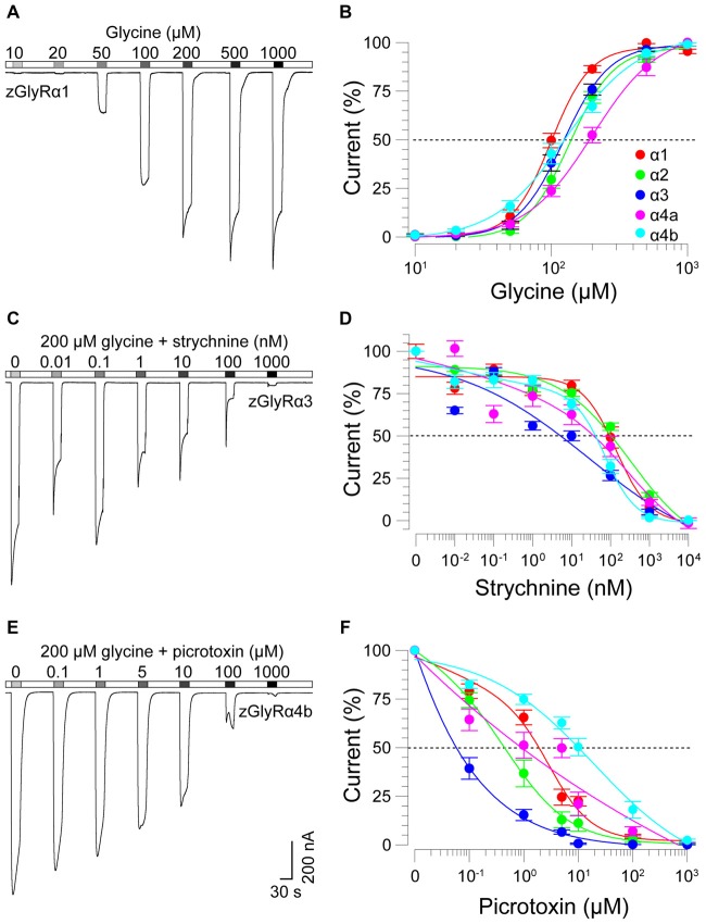 Figure 4. zGlyRα subunits form functional homomeric receptors that are activated by glycine, and inhibited by strychnine and picrotoxin. (A) Two-electrode voltage-clamp recording from an oocyte injected with five femtomoles of zGlyRα1 cRNA exposed to serial application of glycine of increasing amount. Ten oocytes were used for each assay. (B) Cumulative dose-response relationship of glycine-evoked currents. The amplitude of each glycine-evoked response was normalized to the maximally-evoked current for each oocyte (n = 10). Values here and elsewhere represent the average ± SEM. Dashed line denotes EC50. (C,E) Recordings from oocytes exposed to glycine and increasing amounts of strychnine or picrotoxin, respectively (n = 10). (D,F) Cumulative dose-response relationships of strychnine and picrotoxin-blocked currents (n = 10). Extent of blockade was normalized to the current amplitude evoked by 200 μM glycine in each oocyte. Dashed lines denote IC50s.