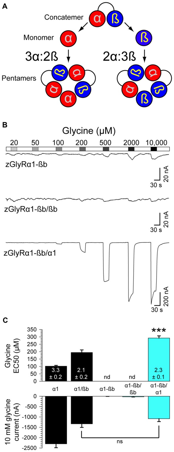Figure 8. Heteromeric zGlyRs assemble with a stoichiometry of 3α:2ß. (A) Schematic detailing the assembly of pentameric zGlyRs from concatemers and either monomeric zGlyRα1 or zGlyRßb. (B) Two-electrode voltage clamp recordings from oocytes injected with cRNA encoding concatemers alone, or with monomeric zGlyRα1 or zGlyRßb cRNA. Note that the current scale bars on the top and middle traces differ from the bottom trace. (C) Average glycine EC50 and responses to 10 mM glycine (n = 10). ***p< 0.001.