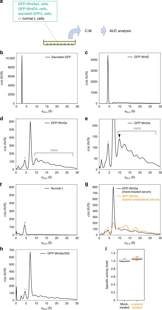 Fig. 1. Analytical ultracentrifugation analyses of GFP-tagged Wnt3a proteins secreted from cultured cells. a Schematic representation of the analysis using AUC. bâf AUC-FDS analysis of secreted GFP (nâ=â3; (b)), GFP-tagged Drosophila WntD (GFP-WntD; nâ=â7; (c)), and GFP-tagged mouse Wnt3a (GFP-Wnt3a; nâ=â20; (d, e)), secreted from stably transformed mouse L cells. As a negative control, AUC-FDS analysis of conditioned medium (C.M.) from neomycin-resistant L cells is also indicated (nâ=â4; (f)); e is an enlarged version of d. HMW indicates high-molecular-weight complex. The closed arrowhead in e indicates the HMW complex with the smallest molecular mass (~9.6âS corresponding to ~200âkDa). g AUC-FDS analysis of GFP-Wnt3a in culture media with mock-treated (black; nâ=â3) or afamin pre-depleted (orange; nâ=â3) serum. The relative area size of the Wnt3a/afamin complex peak, which was normalized by the whole area size obtained in each measurement, was significantly decreased by afamin pre-depletion (relative area of ~ 7.0 peaks was decreased from 35.1â±â6.6% to 14.1â±â1.5% by the pre-depletion (meanâ±âs.d., pâ<â0.05); whereas that of the HMW peaks was increased from 51.1â±â4.8% to 69.6â±â1.2% (meanâ±âs.d., pâ<â0.05, nâ=â3, paired t-test). h AUC-FDS analysis of GFP-Wnt3a secreted from HEK293 cells (nâ=â4). i Wnt signaling activity of GFP-Wnt3a in culture media with mock-treated (black) or afamin pre-depleted (orange) serum. Wnt activity monitored by use of the SuperTOPFlash assay was normalized by the fluorescence intensity of GFP. Peaks marked with asterisks in dâh appeared to be derived from fluorescent molecules bound to serum albumin, such as bilirubin (Supplementary Fig. 3f) |