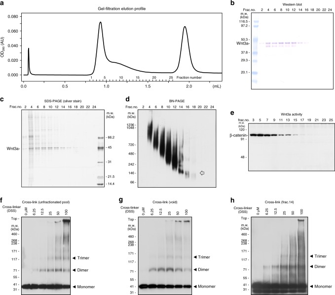 Fig. 3. Characterization of Wnt3a fractionated by gel filtration. a Elution profile of gel filtration column chromatography. Affinity-purified FLAG-Wnt3a proteins, prepared from serum-free medium conditioned with FLAG-Wnt3a-secreting L cells, were subjected to gel filtration column chromatography (Superdex200 PC3.2/30, GE Healthcare). b Analysis of fractionated proteins by western blotting with anti-FLAG antibody. Wnt3a proteins are recovered in widely spread fractions, including a fraction corresponded to the void volume (fraction #4). c Analysis of fractionated proteins by silver staining. Protein whose size corresponded to FLAG-Wnt3a is the major component in fractions from fraction #2 to #16. d Analysis of fractionated proteins by western blotting using Blue Native PAGE (Invitrogen), which can separate high-molecular-weight proteins while maintaining their native conformation. This analysis shows that the size of Wnt-3a protein complex is mostly distributed between ~150âkDa and 1000âkDa. Of note, a discrete band corresponding to 150âkDa is detected in fraction 14. An arrow indicates a discrete band whose molecular weight corresponded to the size of a Wnt trimer. e Wnt signaling activity assessed by application of each fraction to mouse L cells. Since the β-catenin protein level is quite low in the absence of Wnt signaling in L cells, we directly monitored Wnt signaling activity by measuring the β-catenin protein level in these L cells. All of the fractions in which FLAG-Wnt3a was detectable increased the β-catenin level, indicating that Wnt3a protein still possessed its signaling activity. fâh Cross-linking analysis with proteins in unfractionated pool (f), in void volume (g), and in fraction 14 (h). Full blot images of bâh are shown in Supplementary Fig. 9 |